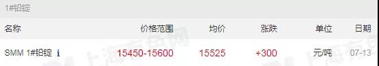 7月13日 周一 鉛價漲300元/噸,均價15525元/噸
